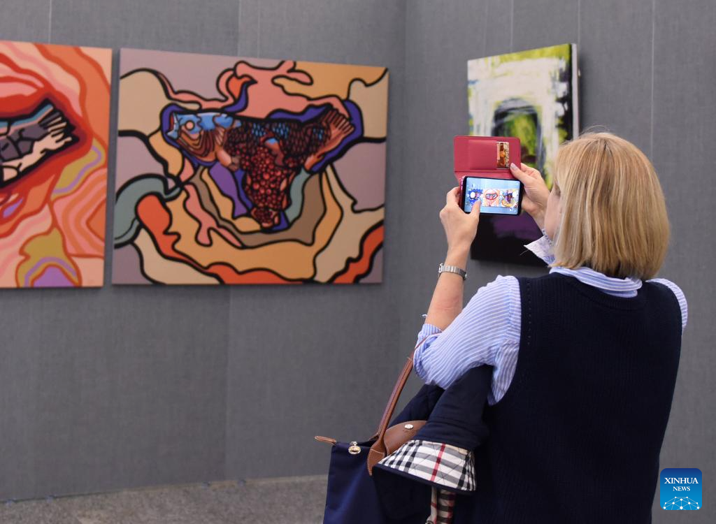 A visitor takes photos of exhibits during the 3rd China-Europe International Art Biennial in Vienna, Austria, on Oct. 6, 2023. The 3rd China-Europe International Art Biennial kicked off here on Friday. (Xinhua/He Canling)
