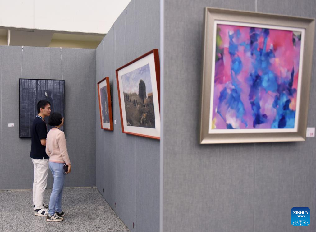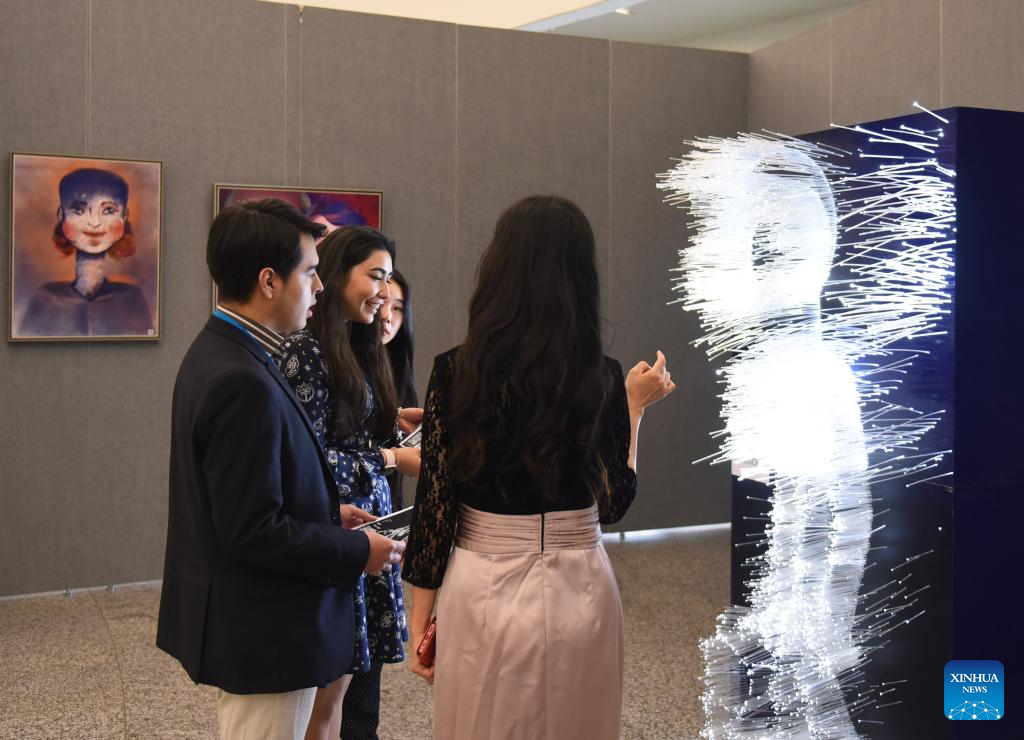 Visitors look at an exhibit during the 3rd China-Europe International Art Biennial in Vienna, Austria, on Oct. 6, 2023. The 3rd China-Europe International Art Biennial kicked off here on Friday. (Xinhua/He Canling)