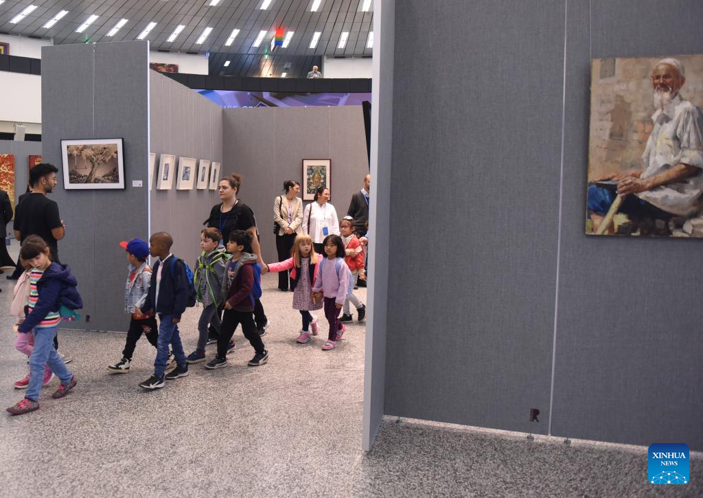 Children walk past exhibits at the 3rd China-Europe International Art Biennial in Vienna, Austria, on Oct. 6, 2023. The 3rd China-Europe International Art Biennial kicked off here on Friday. (Xinhua/He Canling)