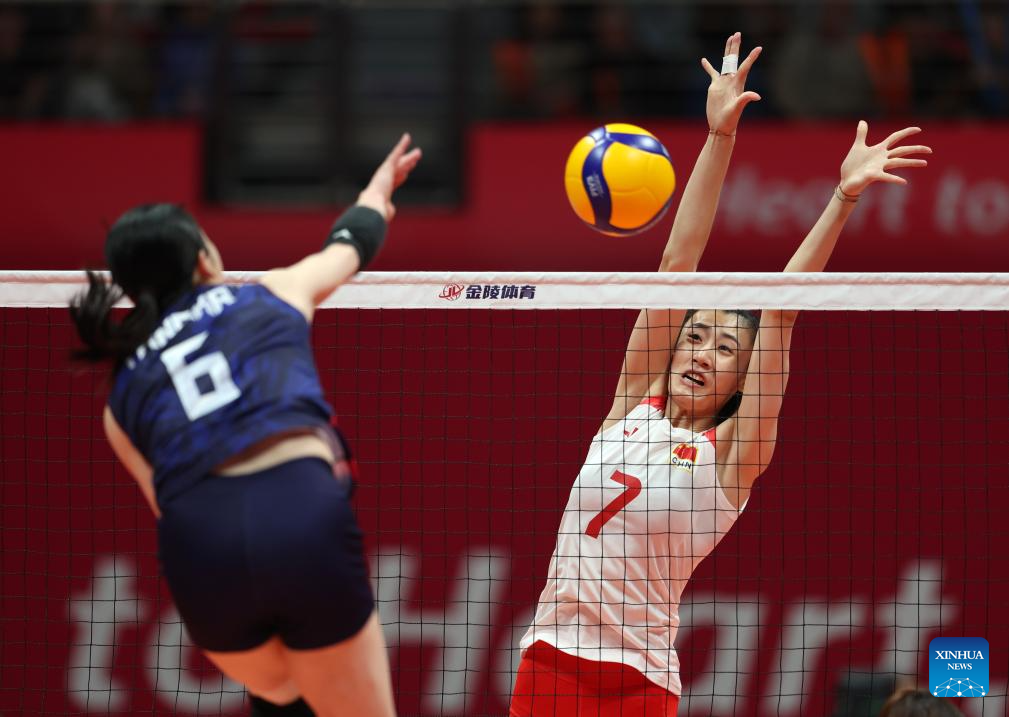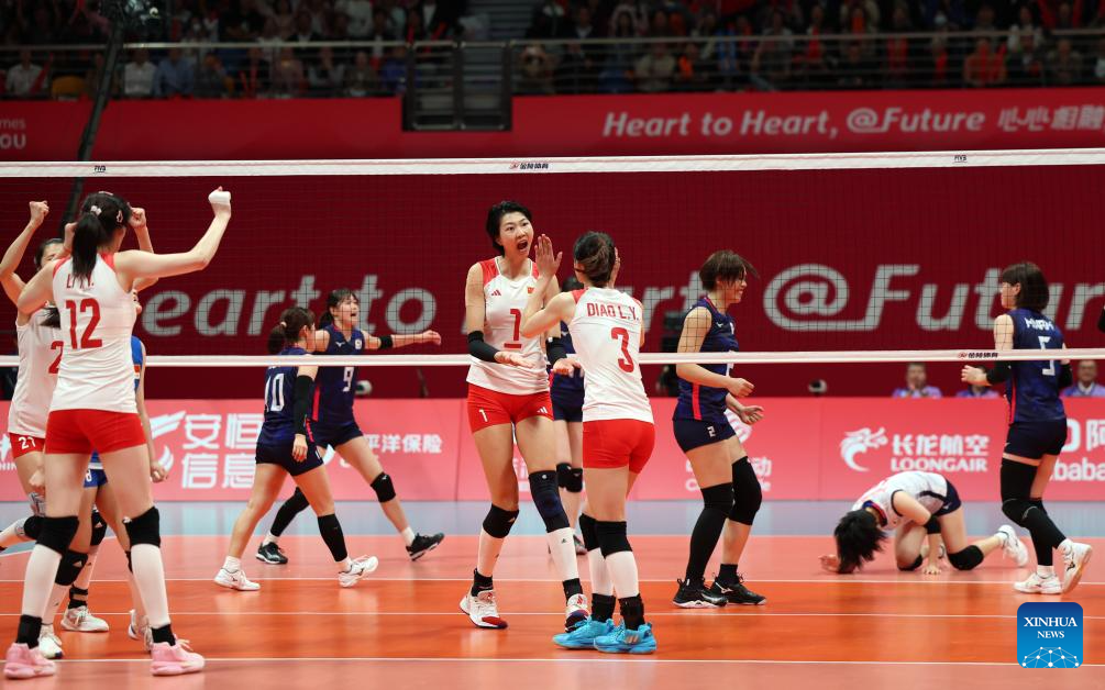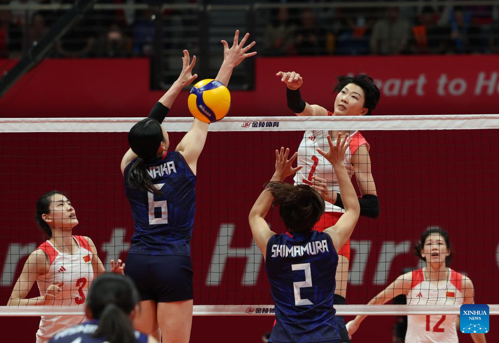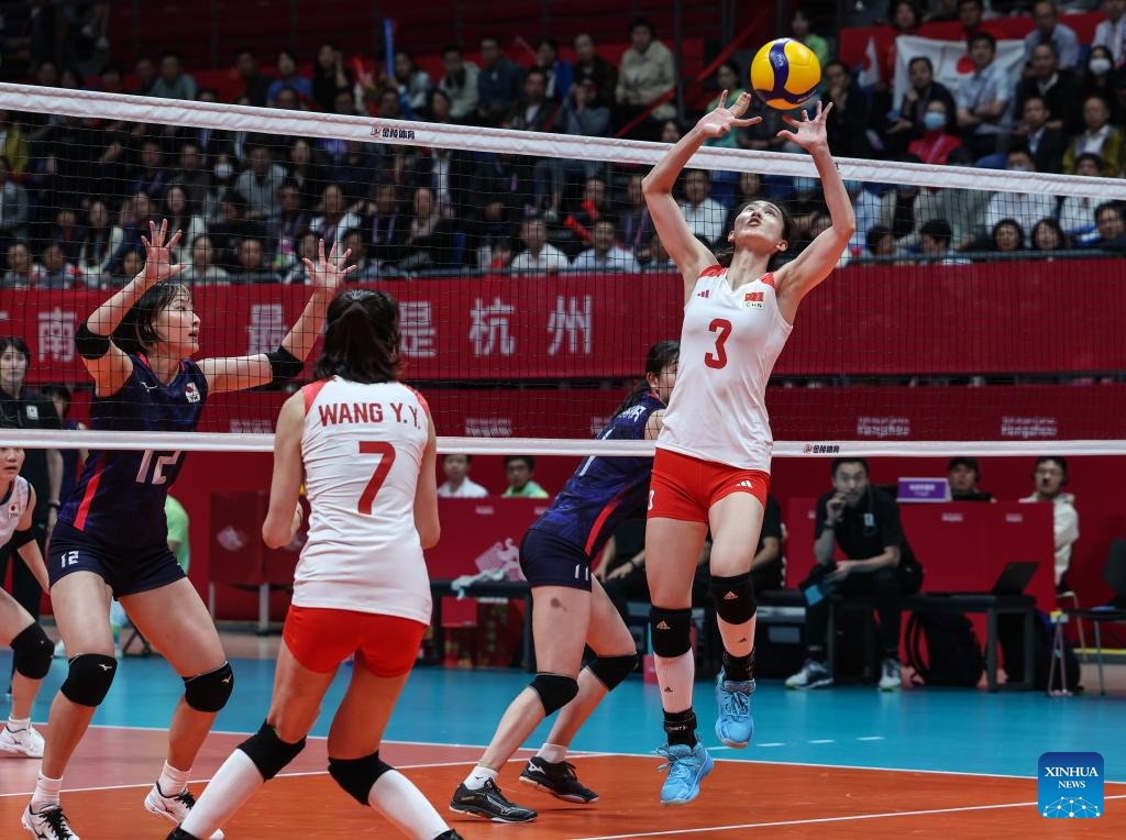 Athletes compete during the Women's Gold Medal Match of Volleyball between China and Japan at the 19th Asian Games in Hangzhou, east China's Zhejiang Province, Oct. 7, 2023. (Xinhua/Zhang Tao)