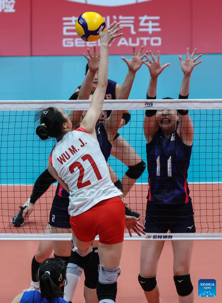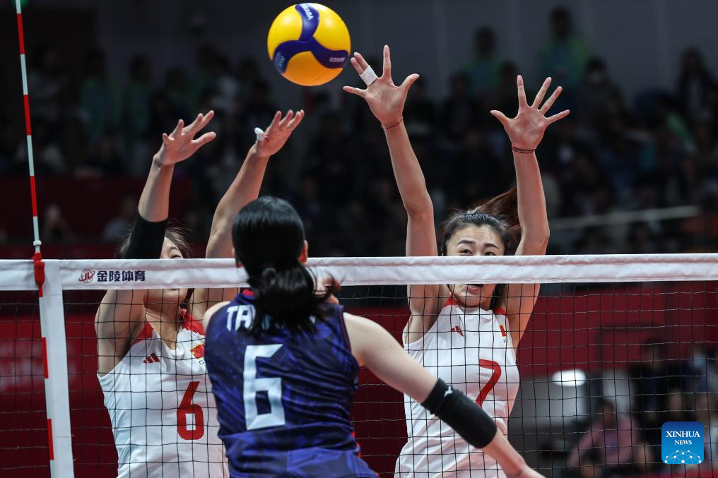 Yuan Xinyue (2nd R) of China competes during the Women's Gold Medal Match of Volleyball between China and Japan at the 19th Asian Games in Hangzhou, east China's Zhejiang Province, Oct. 7, 2023. (Xinhua/Zhang Tao)
