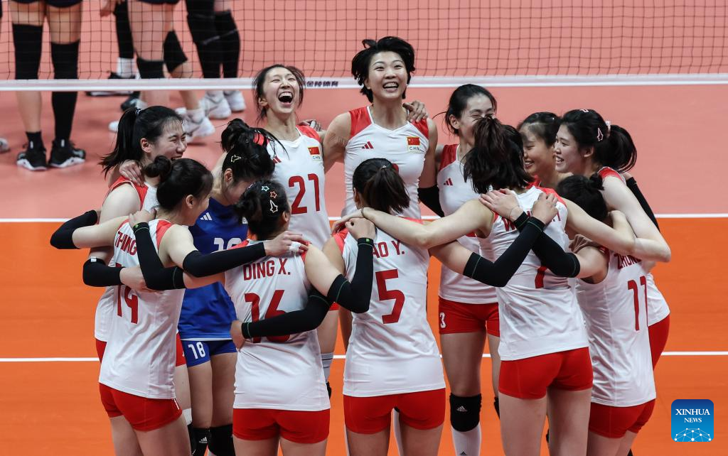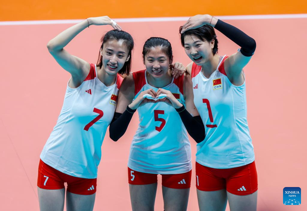 Athletes of China celebrate after the Women's Gold Medal Match of Volleyball between China and Japan at the 19th Asian Games in Hangzhou, east China's Zhejiang Province, Oct. 7, 2023. (Xinhua/Zhang Tao)