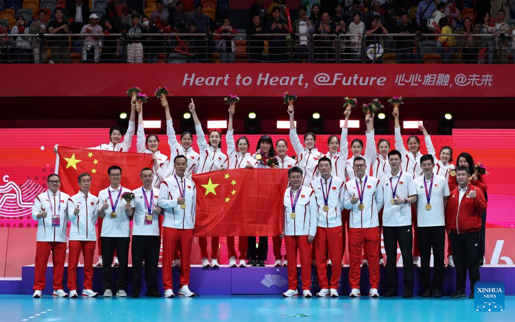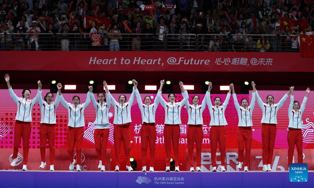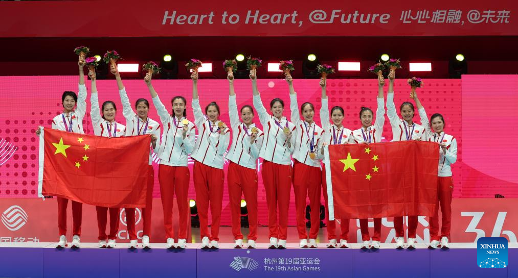Athletes of China attend the medal ceremony for the Women's Volleyball at the 19th Asian Games in Hangzhou, east China's Zhejiang Province, Oct. 7, 2023. (Xinhua/Zhang Tao)