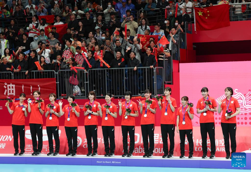 Athletes of Japan attend the medal ceremony for the Women's Volleyball at the 19th Asian Games in Hangzhou, east China's Zhejiang Province, Oct. 7, 2023. (Xinhua/Zhang Tao)