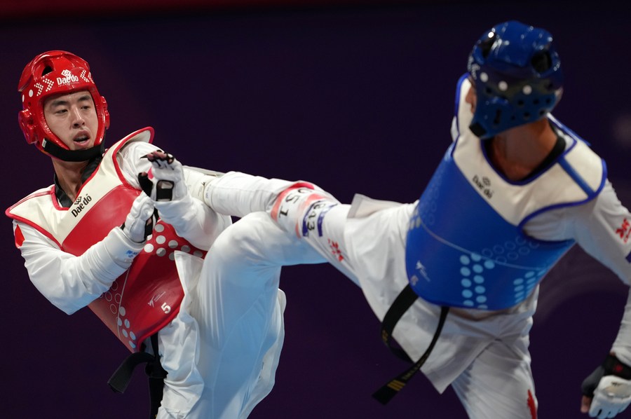 Song Zhaoxiang (L) of China competes against Iran's Arian Salimi during the men's +80kg taekwondo gold medal contest on Sept. 28, 2023. (Xinhua/Jiang Wenyao)