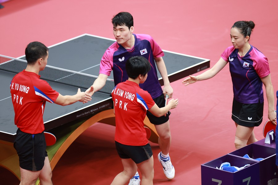 Ham Yu Song (L) and Kim Kum Yong of DPR Korea shake hands with Jang Woo-jin (Top) and Jeon Ji-hee of South Korea after their table tennis mixed doubles round of 16 match on Sept. 28, 2023. (Xinhua/Liu Xu)