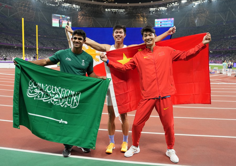 Ernest John Obiena (C) of the Philippines, Huang Bokai (R) of China and Hussain Asim M Al Hizam of Saudi Arabia celebrate after the men's pole vault on Sept. 30, 2023. (Xinhua/Li Yibo)