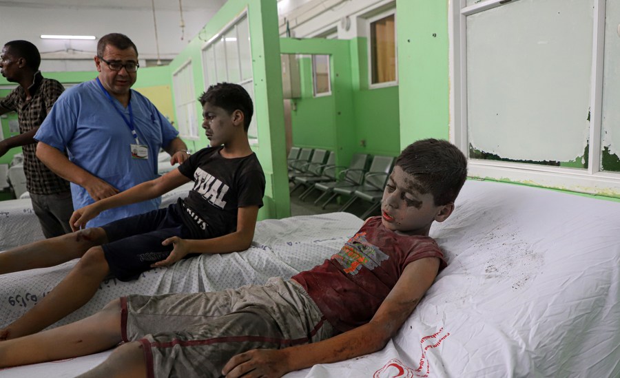 Children injured in an Israeli airstrike are treated at a hospital in Gaza City, on Oct. 9, 2023. (Photo by Rizek Abdeljawad/Xinhua)