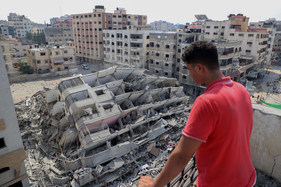 A man looks at destroyed buildings following an Israeli airstrike in Gaza City, Oct. 8, 2023. (Photo by Rizek Abdeljawad/Xinhua)