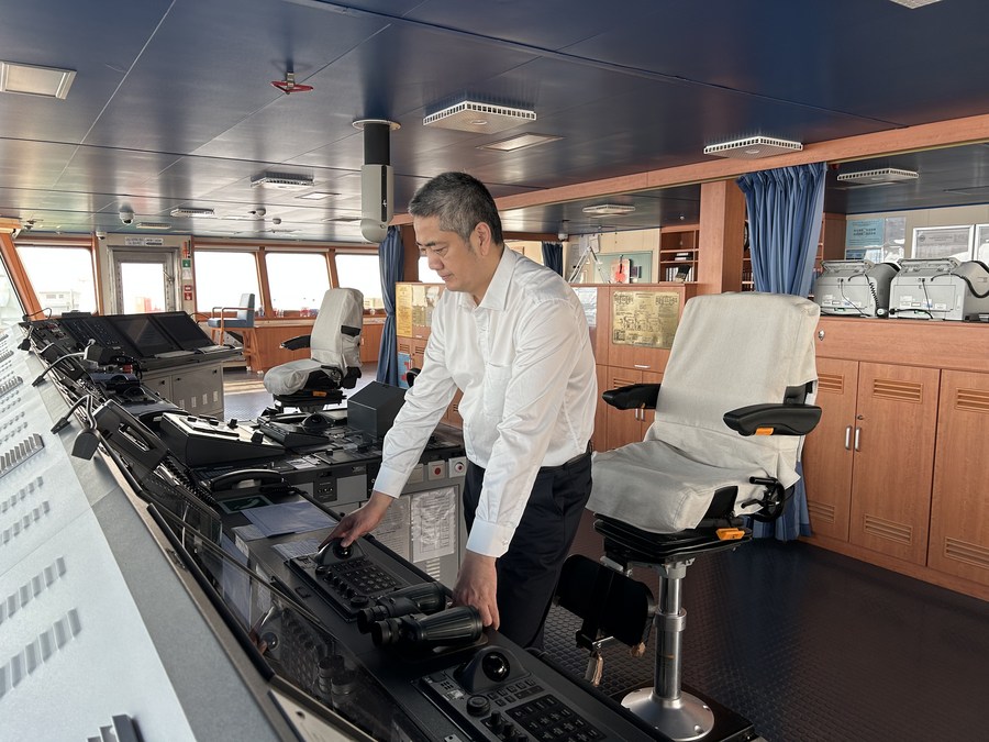 Captain Mo Weidong operates the radar at the bridge of the container ship Cosco Shipping Virgo on its way to Rotterdam Port, in the Mediterranean Sea, Sept. 15, 2023. (Xinhua)