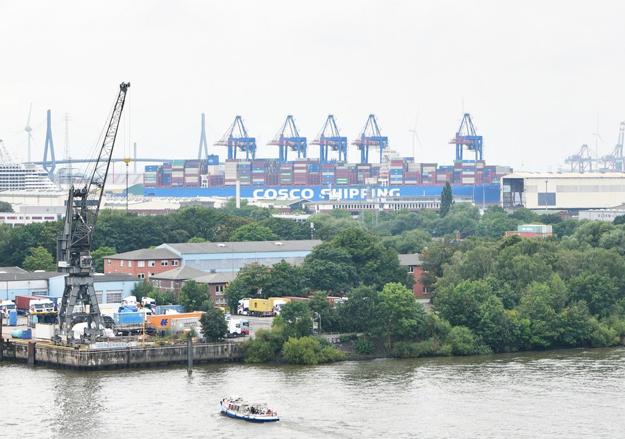 A container ship of China's COSCO Shipping calls at the Port of Hamburg in Germany, Aug. 12, 2023. (Xinhua/Ren Pengfei)