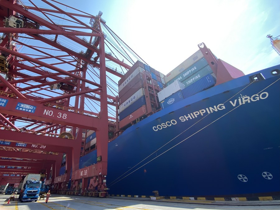 The container ship Cosco Shipping Virgo calls at Meishan port area of Ningbo Zhoushan Port in east China's Zhejiang Province, Aug. 21, 2023. (Xinhua/Wei Yijun)