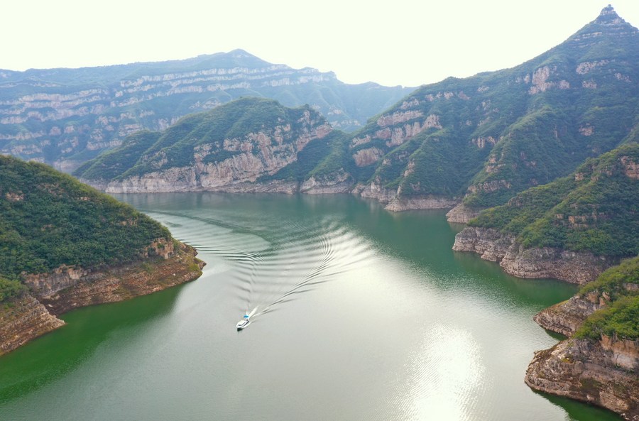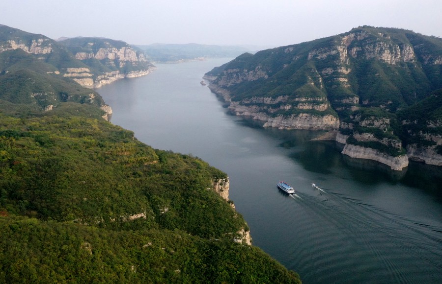 This aerial photo taken on Oct. 8, 2023 shows the scenery of a canyon located upstream of Xiaolangdi water conservancy project on the Yellow River in Jiyuan City, central China's Henan Province. (Xinhua/Xing Guangli)