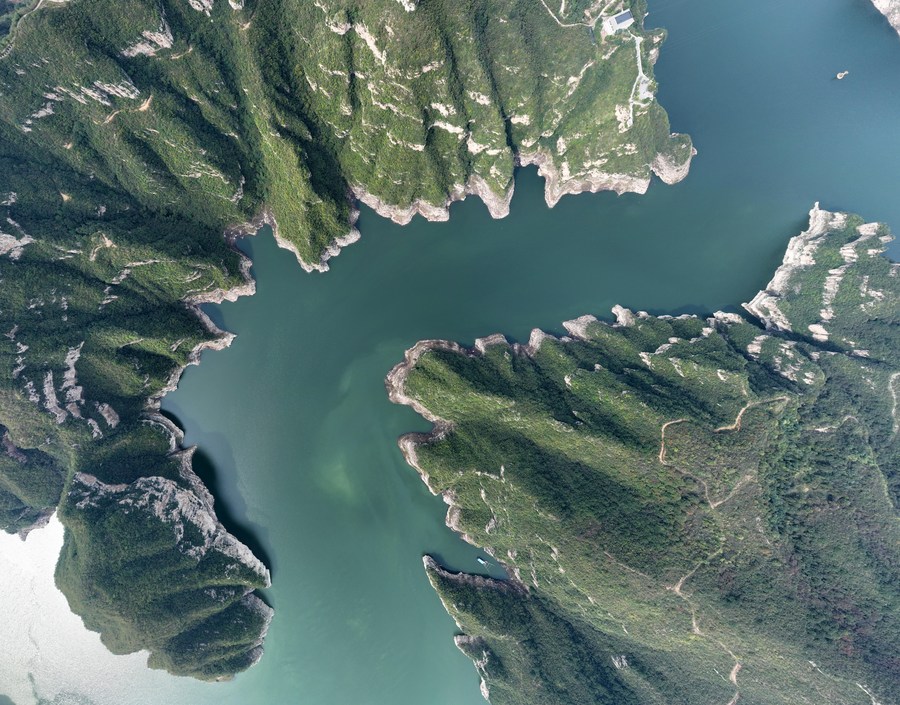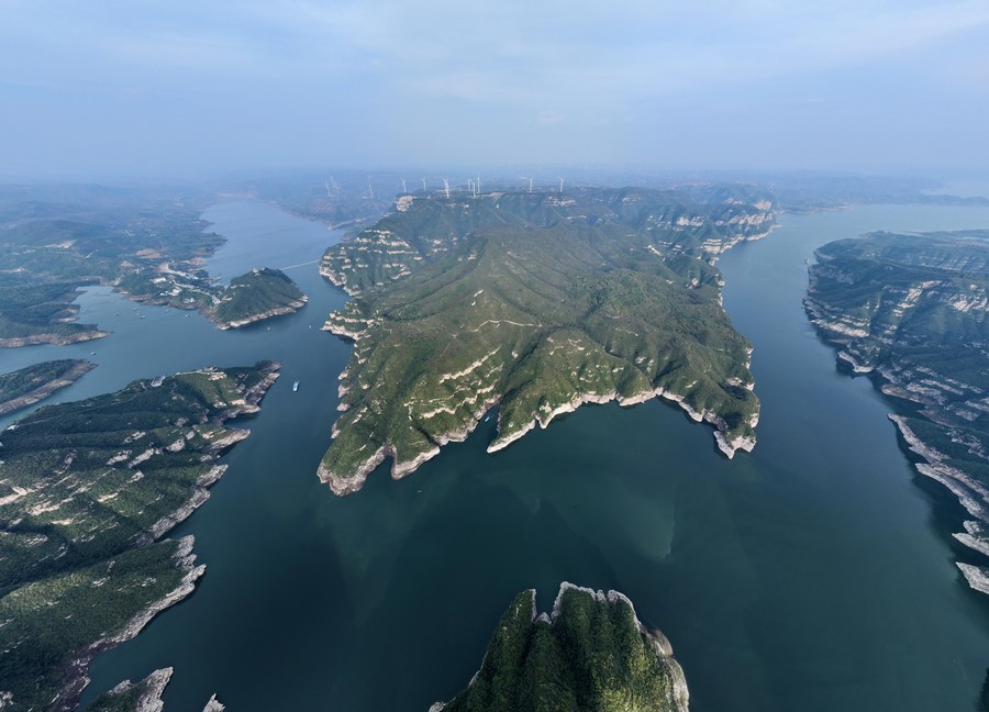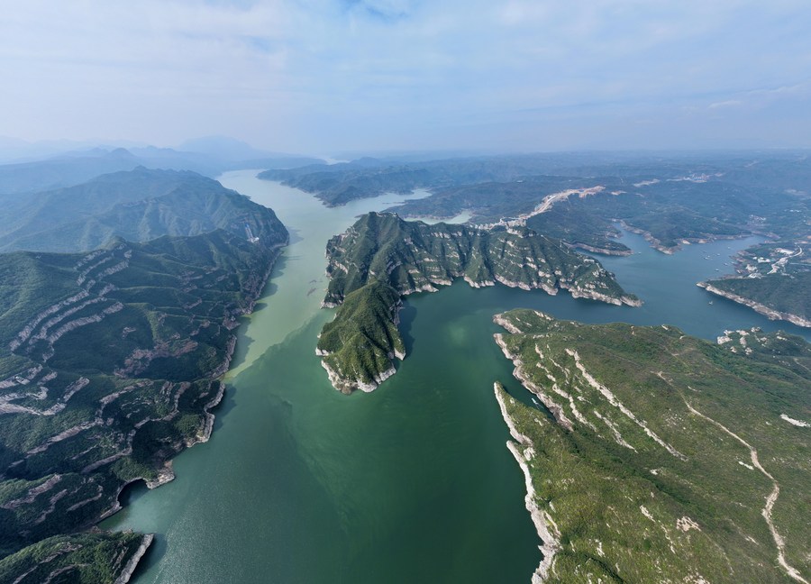 This aerial photo taken on Oct. 8, 2023 shows the scenery of a canyon located upstream of Xiaolangdi water conservancy project on the Yellow River in Jiyuan City, central China's Henan Province. (Xinhua/Li Jianan)