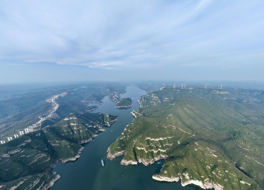 This aerial panoramic photo taken on Oct. 8, 2023 shows the scenery of a canyon located upstream of Xiaolangdi water conservancy project on the Yellow River in Jiyuan City, central China's Henan Province. (Xinhua/Hao Yuan)