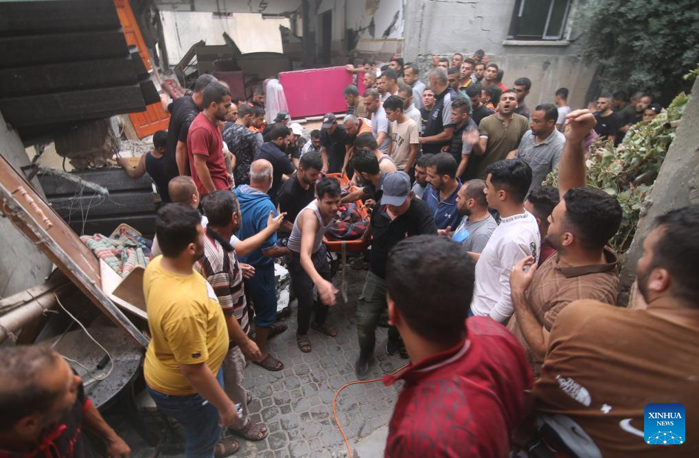 People remove a person from a destroyed building following an Israeli airstrike in the southern Gaza Strip city of Rafah on Oct. 9, 2023. At least 493 Palestinians have been killed and 2,751 others wounded in Israeli airstrikes on the Gaza Strip, the Hamas-run health ministry said on Monday. At least 800 people have been killed in the mass assault launched by the Palestinian Islamic Resistance Movement (Hamas) on Israel, Israel's state-owned Kan TV news reported on Monday. (Photo by Khaled Omar/Xinhua)
