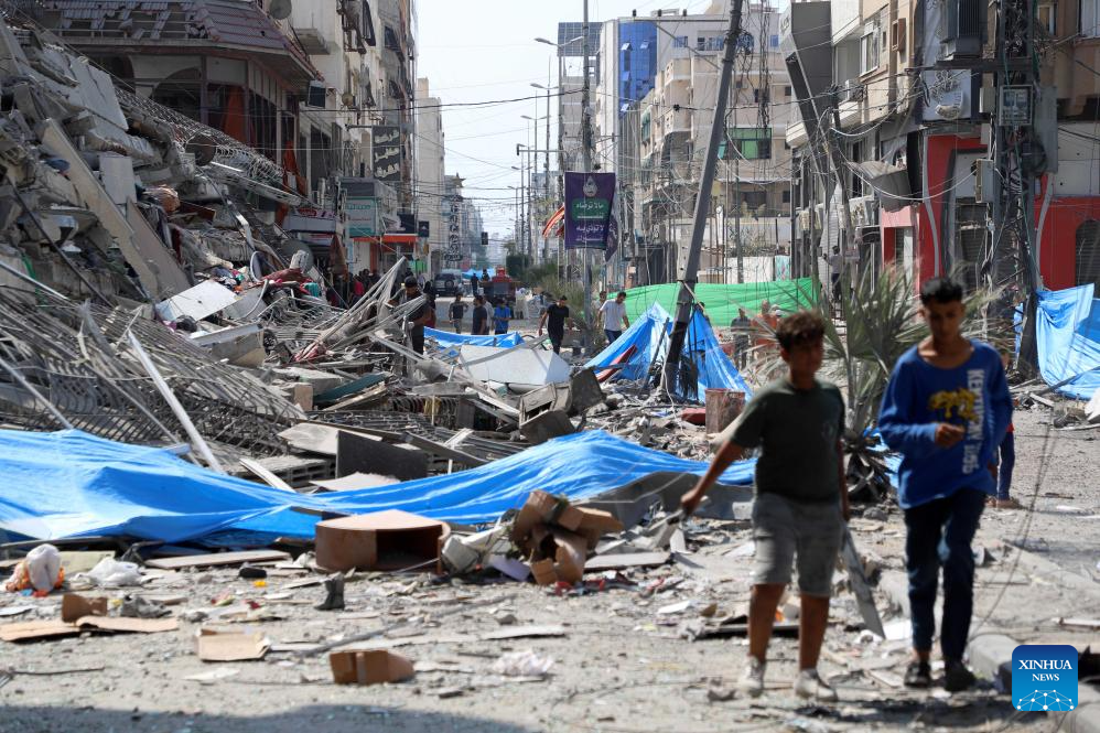 Palestinians check a damaged street following an Israeli airstrike in Gaza City, Oct. 8, 2023. At least 493 Palestinians have been killed and 2,751 others wounded in Israeli airstrikes on the Gaza Strip, the Hamas-run health ministry said on Monday, while Israel's state-owned Kan TV news reported the death toll in Israel has reached 700. (Photo by Rizek Abdeljawad/Xinhua)