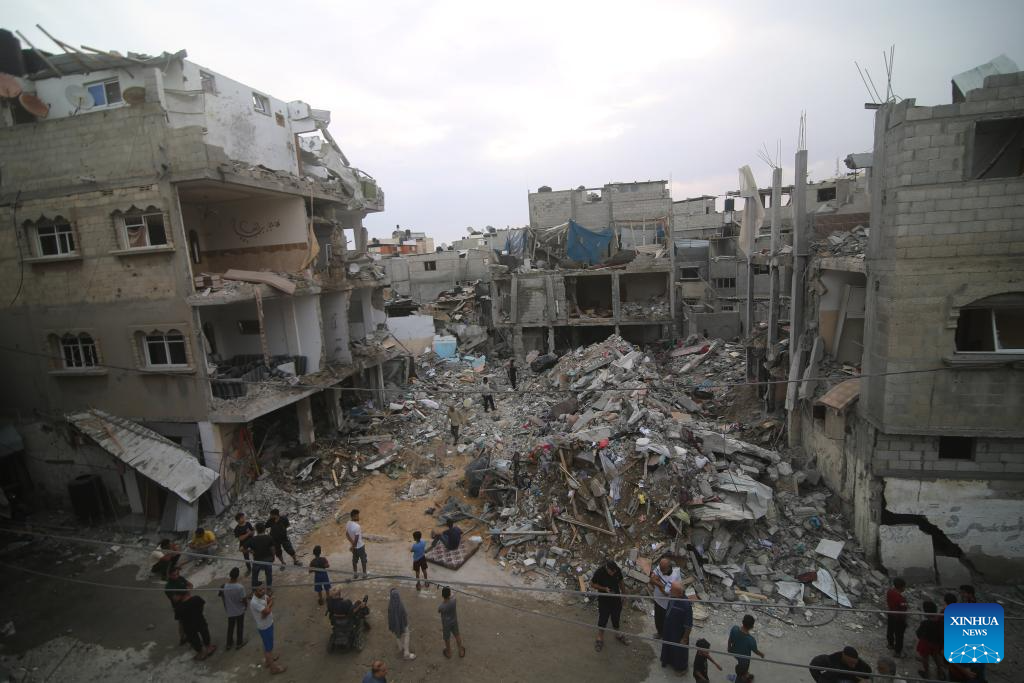 People gather near a destroyed building following an Israeli airstrike in the southern Gaza Strip city of Rafah on Oct. 9, 2023. At least 493 Palestinians have been killed and 2,751 others wounded in Israeli airstrikes on the Gaza Strip, the Hamas-run health ministry said on Monday. At least 800 people have been killed in the mass assault launched by the Palestinian Islamic Resistance Movement (Hamas) on Israel, Israel's state-owned Kan TV news reported on Monday. (Photo by Khaled Omar/Xinhua)