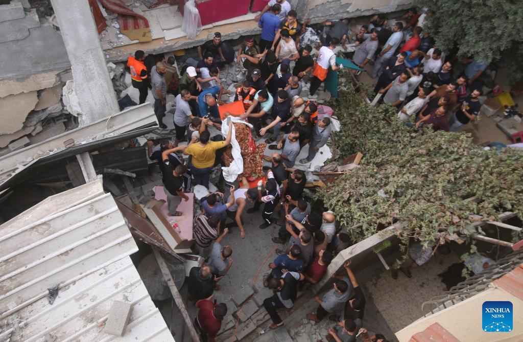 People remove a person from a destroyed building following an Israeli airstrike in the southern Gaza Strip city of Rafah on Oct. 9, 2023. At least 493 Palestinians have been killed and 2,751 others wounded in Israeli airstrikes on the Gaza Strip, the Hamas-run health ministry said on Monday. At least 800 people have been killed in the mass assault launched by the Palestinian Islamic Resistance Movement (Hamas) on Israel, Israel's state-owned Kan TV news reported on Monday. (Photo by Khaled Omar/Xinhua)