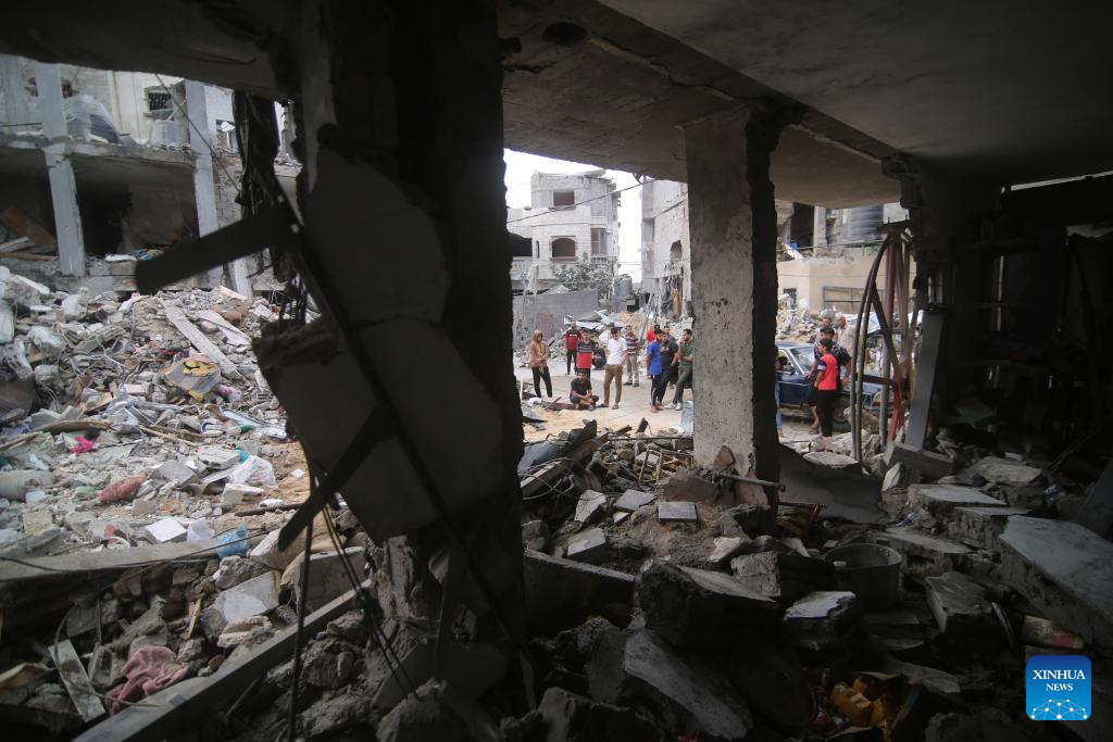 People gather near a destroyed building following an Israeli airstrike in the southern Gaza Strip city of Rafah on Oct. 9, 2023. At least 493 Palestinians have been killed and 2,751 others wounded in Israeli airstrikes on the Gaza Strip, the Hamas-run health ministry said on Monday. At least 800 people have been killed in the mass assault launched by the Palestinian Islamic Resistance Movement (Hamas) on Israel, Israel's state-owned Kan TV news reported on Monday. (Photo by Khaled Omar/Xinhua)
