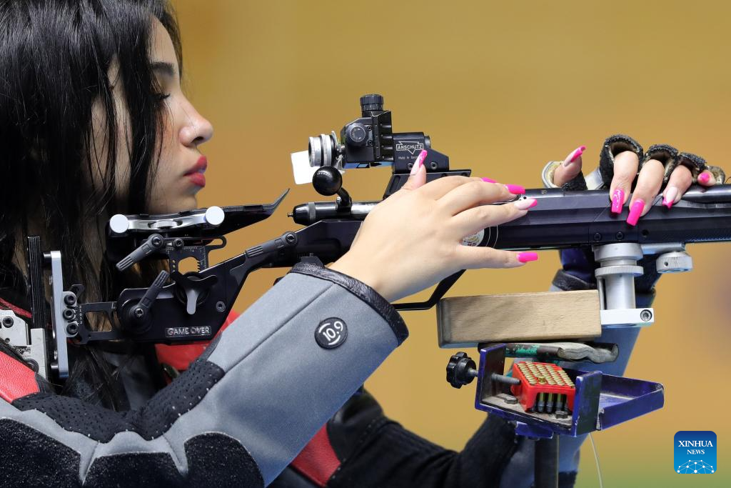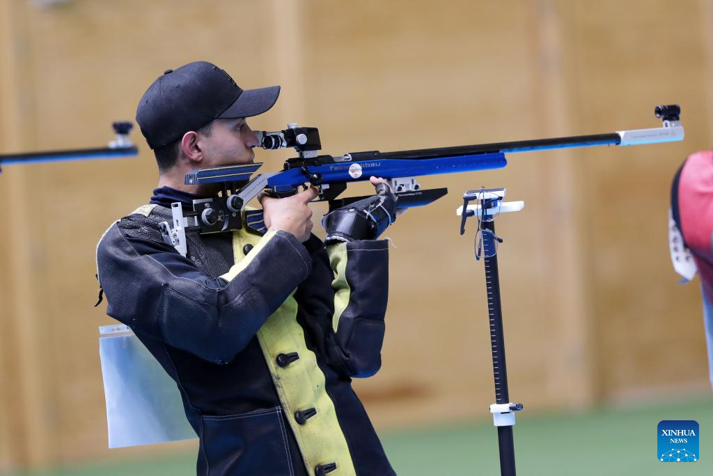 Tayee Merna of Egypt competes during the final of men's 50m rifle 3 positions during the African Shooting Championship in Cairo, Egypt, Oct. 8, 2023. (Xinhua/Ahmed Gomaa)
