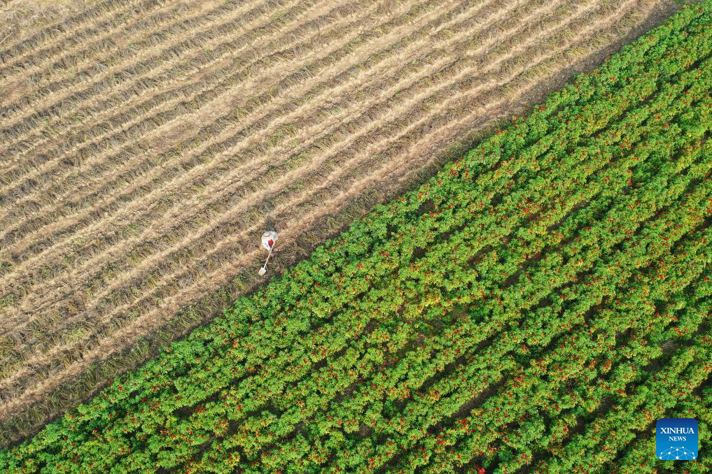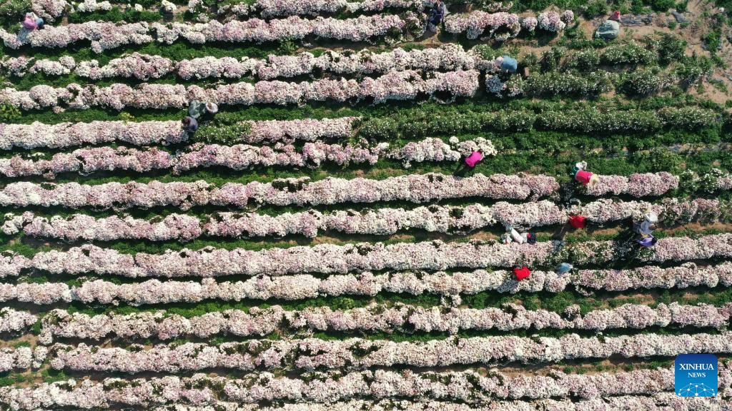 This aerial photo taken on Oct. 10, 2023 shows farmers picking chrysanthemum flowers at a planting base in Jiazhuang Village, Shijiazhuang City, north China's Hebei Province. (Photo by Chen Qibao/Xinhua)
