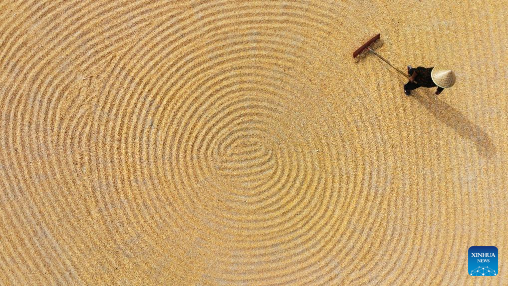This aerial photo taken on Oct. 10, 2023 shows a farmer airing harvested corns in Dagaozhuang Village, Tancheng County, east China's Shandong Province. (Photo by Zhang Chunlei/Xinhua)