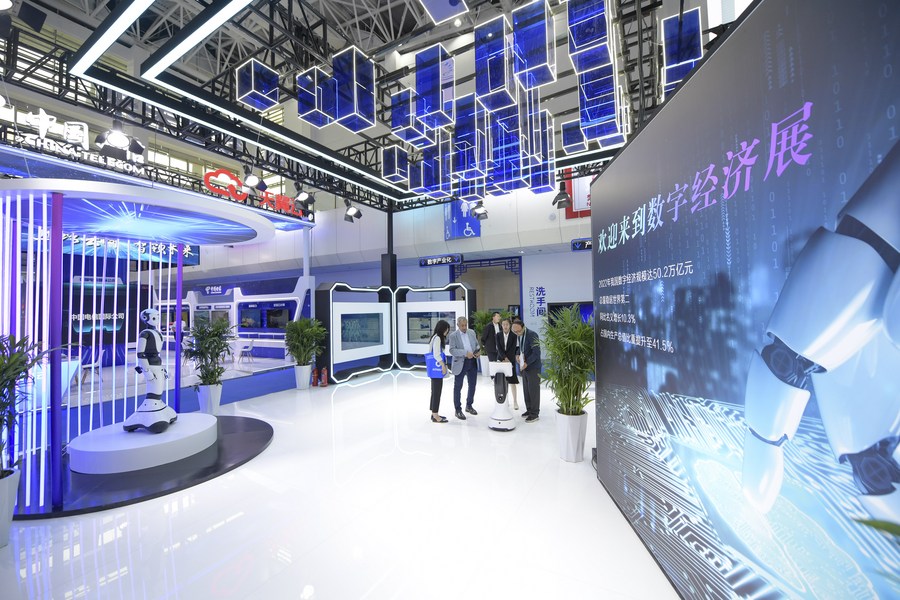 Guests are seen at the digital economy exhibition area of the sixth China-Arab States Expo in Yinchuan, northwest China's Ningxia Hui Autonomous Region, Sept. 22, 2023. First held in 2013, the China-Arab States Expo has become an important platform for China and Arab states to promote pragmatic cooperation and advance high-quality Belt and Road cooperation. (Xinhua/Feng Kaihua)
