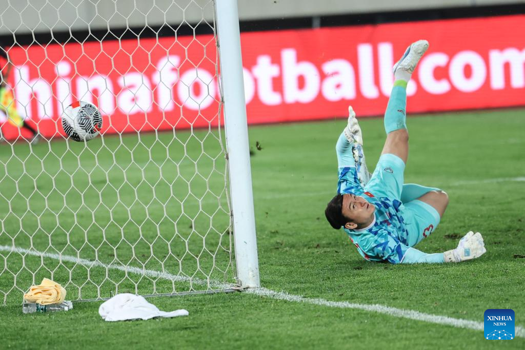 Dang Van Lam of Vietnam fails to save the ball during an international friendly football match between China and Vietnam in Dalian, northeast China's Liaoning Province, Oct. 10, 2023. (Xinhua/Pan Yulong)