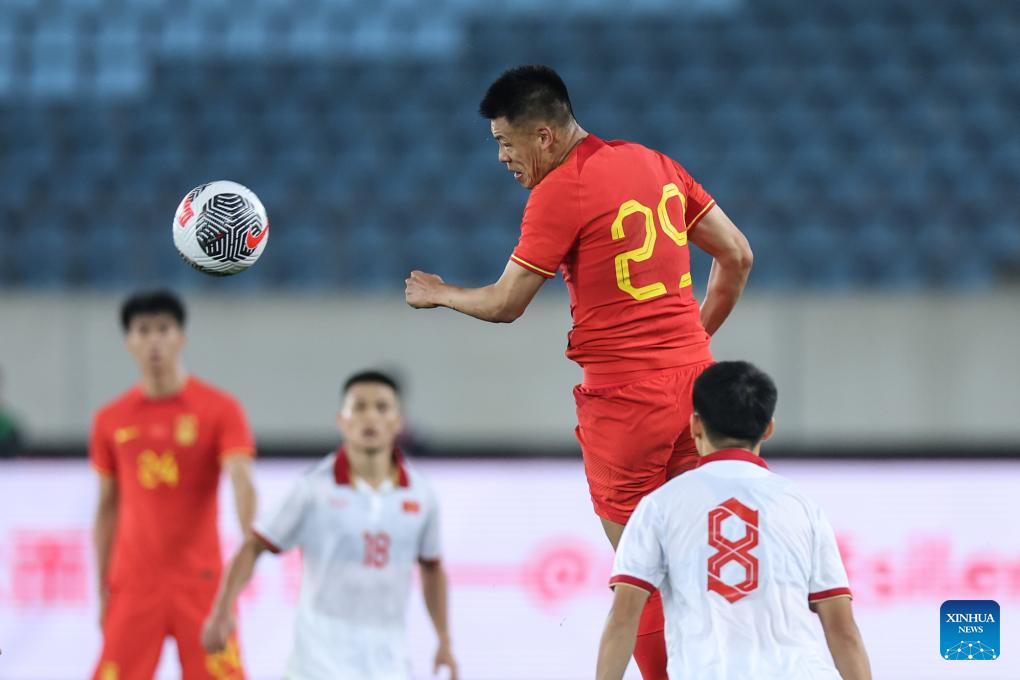 Tan Long (Top) of China heads the ball during an international friendly football match between China and Vietnam in Dalian, northeast China's Liaoning Province, Oct. 10, 2023. (Xinhua/Pan Yulong)