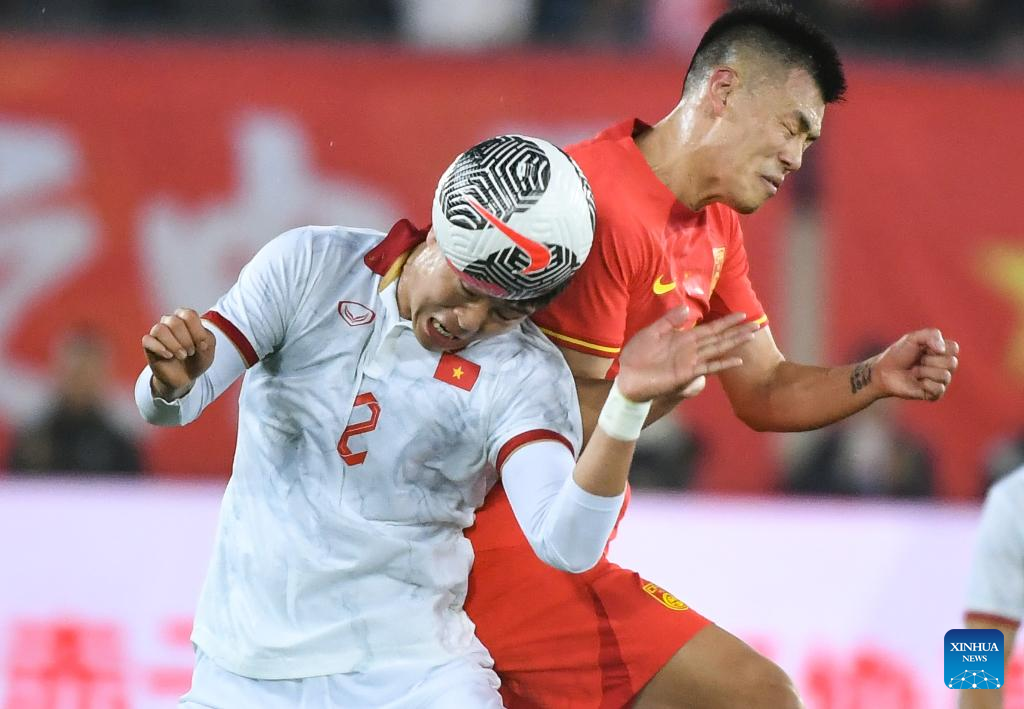 Do Duy Manh (L) of Vietnam heads the ball during an international friendly football match between China and Vietnam in Dalian, northeast China's Liaoning Province, Oct. 10, 2023. (Xinhua/Long Lei)