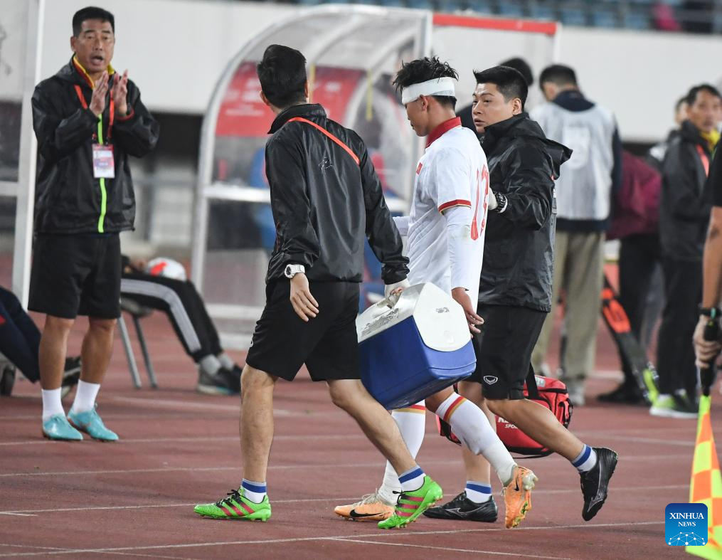 Ho Van Cuong (C) of Vietnam is injured and leaves the pitch during an international friendly football match between China and Vietnam in Dalian, northeast China's Liaoning Province, Oct. 10, 2023. (Xinhua/Long Lei)