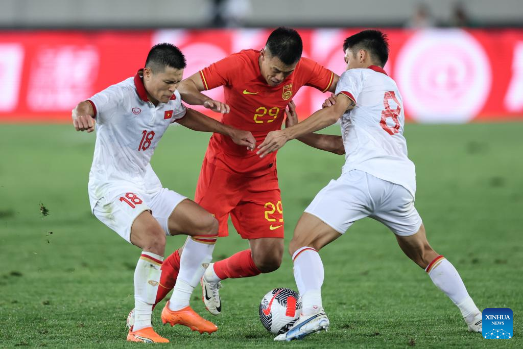 He Yupeng (C) of China passes the ball during an international friendly football match between China and Vietnam in Dalian, northeast China's Liaoning Province, Oct. 10, 2023. (Xinhua/Pan Yulong)