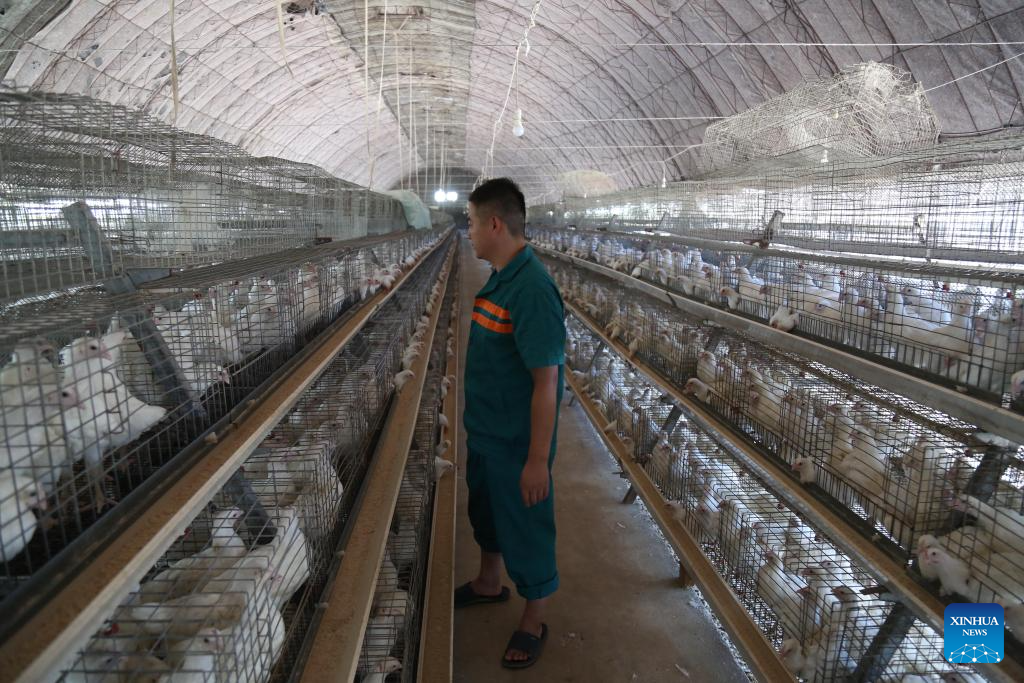 Chinese technician Wang Zhennan checks the breeding stock from China at a chicken house in Tanzania, Aug. 9, 2023. (Photo by Herman Emmanuel/Xinhua)