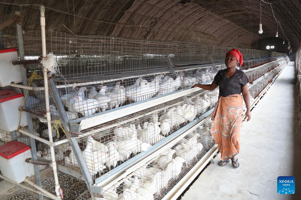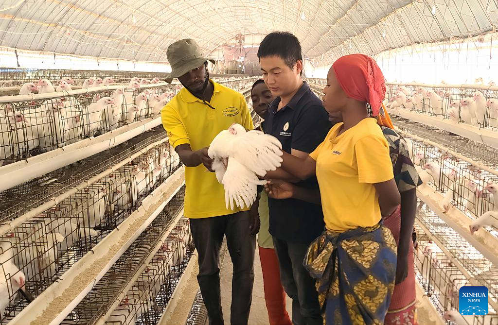 A breeder checks the breeding stock from China at a chicken house in Tanzania, Aug. 9, 2023. (Photo by Herman Emmanuel/Xinhua)