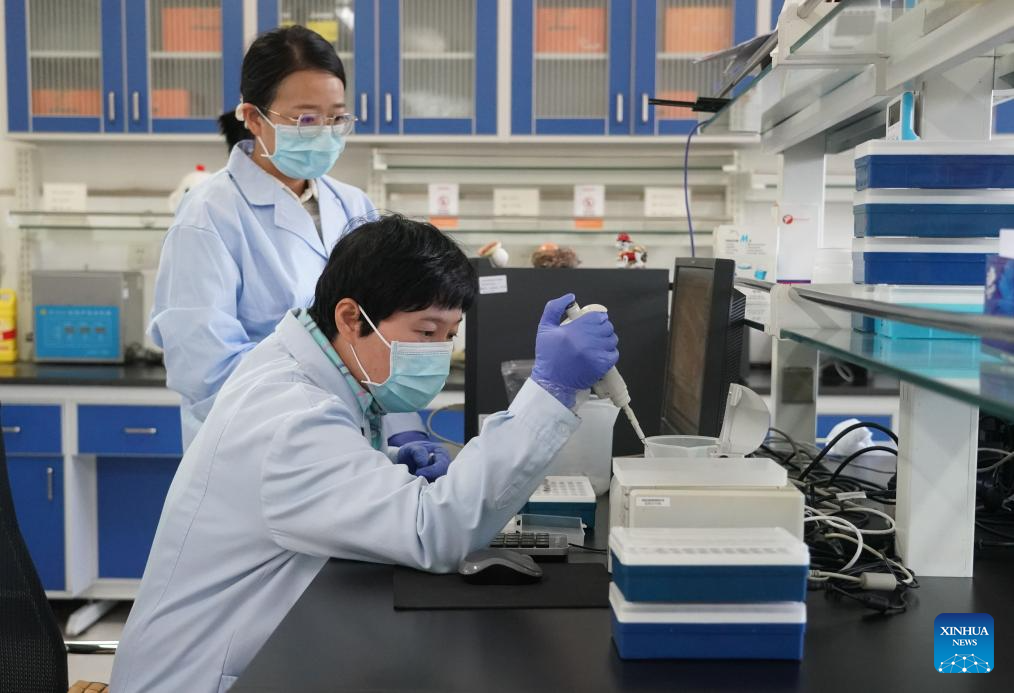 Technicians work in a lab at Beijing Huadu Yukou Poultry Industry Co., Ltd. in Pinggu District, Beijing, capital of China, Oct. 10, 2023. (Xinhua/Ren Chao)