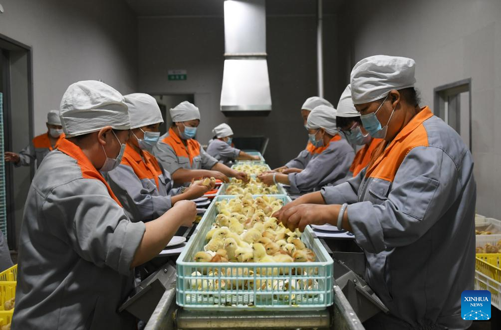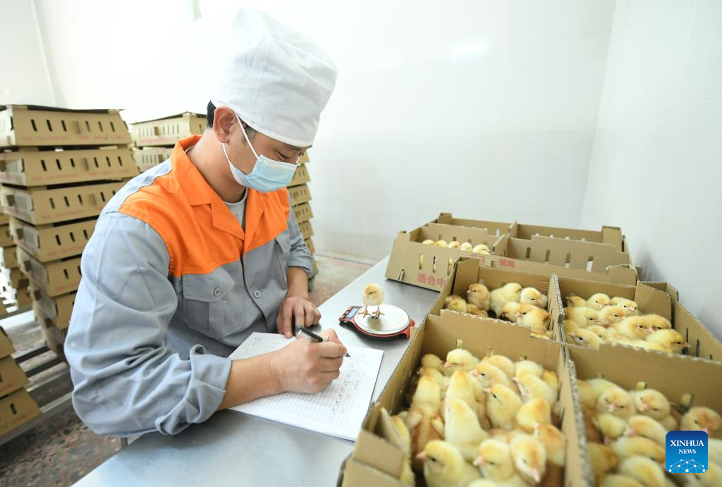 Staff members select chicks of the high-yield layer at Beijing Huadu Yukou Poultry Industry Co., Ltd. in Pinggu District, Beijing, capital of China, Oct. 25, 2021. (Xinhua/Ren Chao)