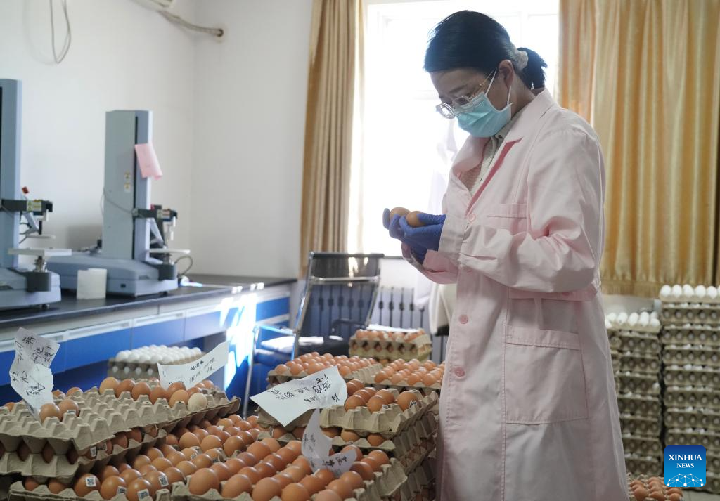 A technician checks eggs at Beijing Huadu Yukou Poultry Industry Co., Ltd. in Pinggu District, Beijing, capital of China, Oct. 10, 2023. (Xinhua/Ren Chao)?