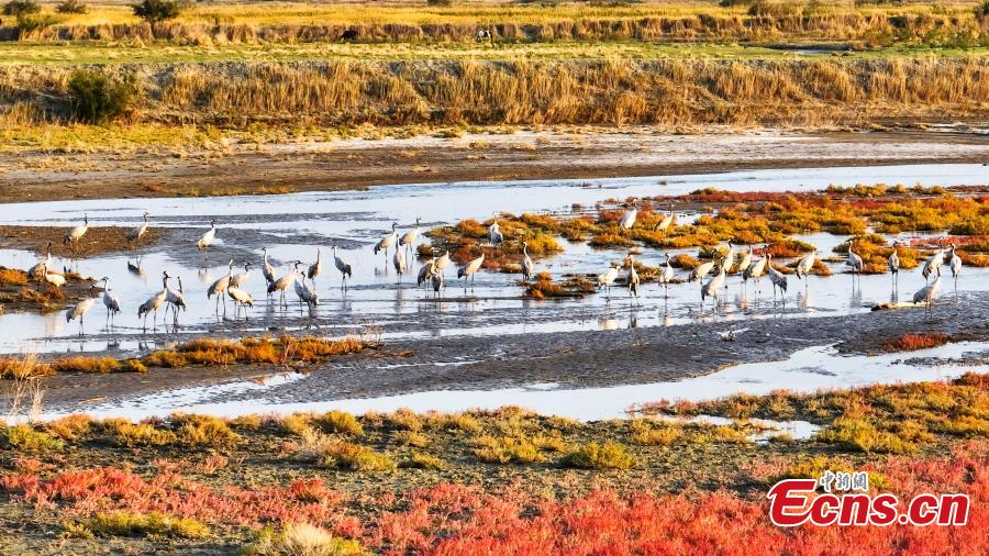 A flock of gray cranes forage at Ebinur Lake wetland natural reserve in Bortala Mongol Autonomous Prefecture, northwest China’s Xinjiang Uyghur Autonomous Region. (Photo: China News Service/Qin Guilian)