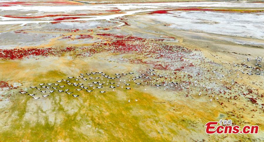A flock of gray cranes forage at Ebinur Lake wetland natural reserve in Bortala Mongol Autonomous Prefecture, northwest China’s Xinjiang Uyghur Autonomous Region. (Photo: China News Service/Qin Guilian)