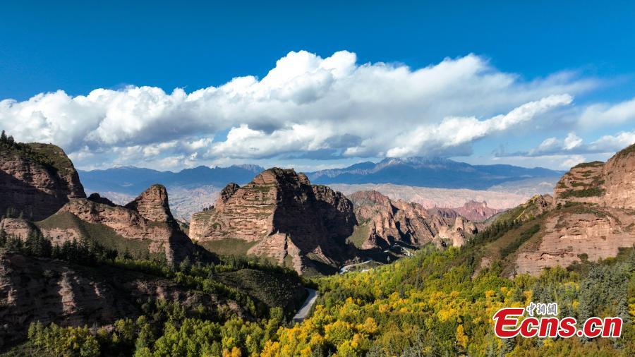 Facing the Yellow River, the Kanbula National Geopark features stone peaks of Danxia landform with golden scenery in autumn in Jianzha County, Huangnan Tibetan Autonomous Prefecture, northwest China's Qinghai Province. It is a "historical documentary" of the evolvement of the rise of the Qinghai-Tibet Plateau and its climate. (Photo provided to China News Service)