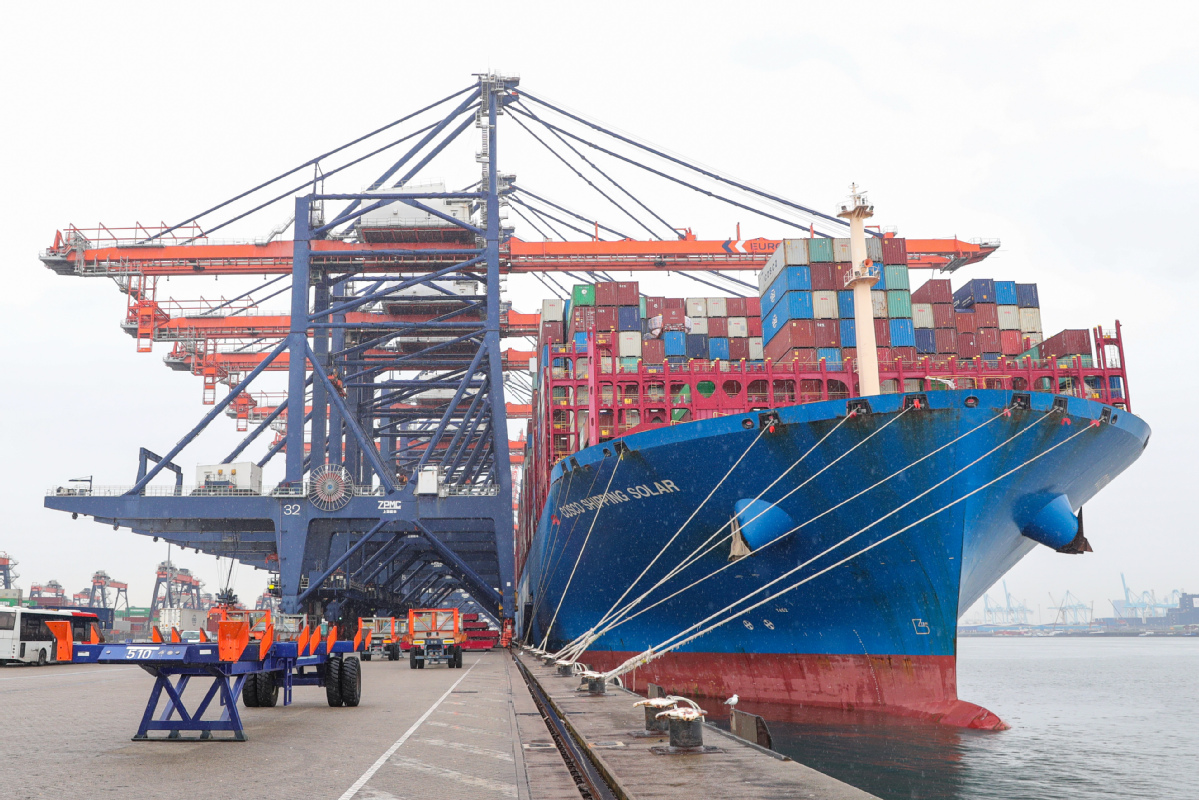 A cargo ship of COSCO Shipping Group docks at the port of Rotterdam, the Netherlands, on May 1, 2023. [Photo/Xinhua]