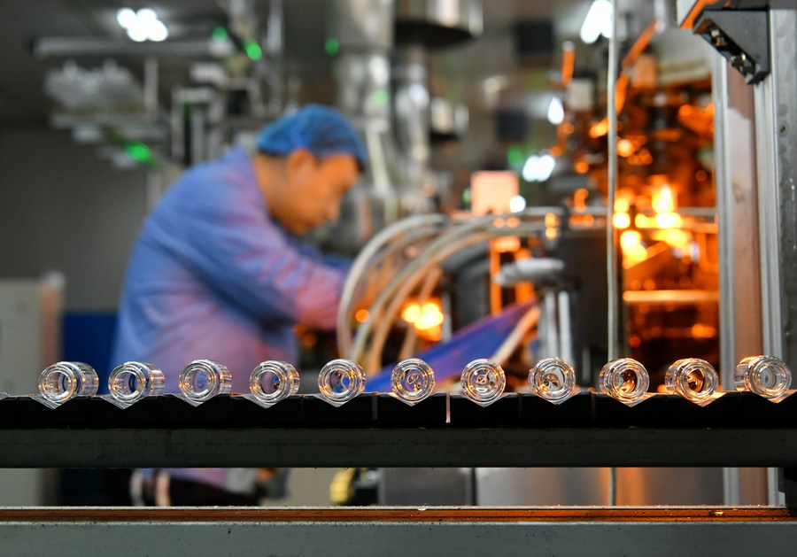 A man works in the workshop of a glass company in Cangxian County, north China's Hebei Province, on Feb. 8, 2023. (Xinhua/Mu Yu)