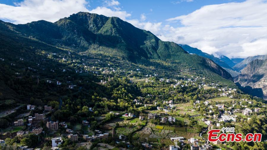 A beautiful scene of traditional Tibetan houses on green mountain under the blue sky in Zhonglu Village of Danba County, Ganzi Tibetan Autonomous Prefecture, southwest China’s Sichuan Province, Oct. 10, 2023. (Photo: China News Service/Sun Zhongnan)