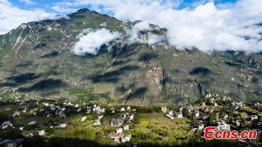 A beautiful scene of traditional Tibetan houses on green mountain under the blue sky in Zhonglu Village of Danba County, Ganzi Tibetan Autonomous Prefecture, southwest China’s Sichuan Province, Oct. 10, 2023. (Photo: China News Service/Sun Zhongnan)