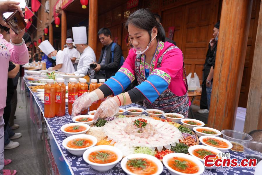 Villagers participate in a raw fish serving contest during a folk festival to celebrate harvest in Longsheng County of Guilin, south China's Guangxi Zhuang Autonomous Region, Oct. 10, 2023. (Photo: China News Service/Wei Jiyang)
