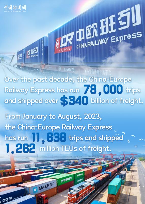 China-Europe freight trains have completed 78,000 trips in the past 10 years and shipped more than $340 billion worth of cargo in 7.4 million standard containers, Chinese Foreign Ministry spokesperson Wang Wenbin said during a routine press conference on Tuesday. China-Europe freight trains now reach more than 200 cities in 25 European countries, and more than 100 cities in 11 Asian countries and regions, after their operations started in 2013.