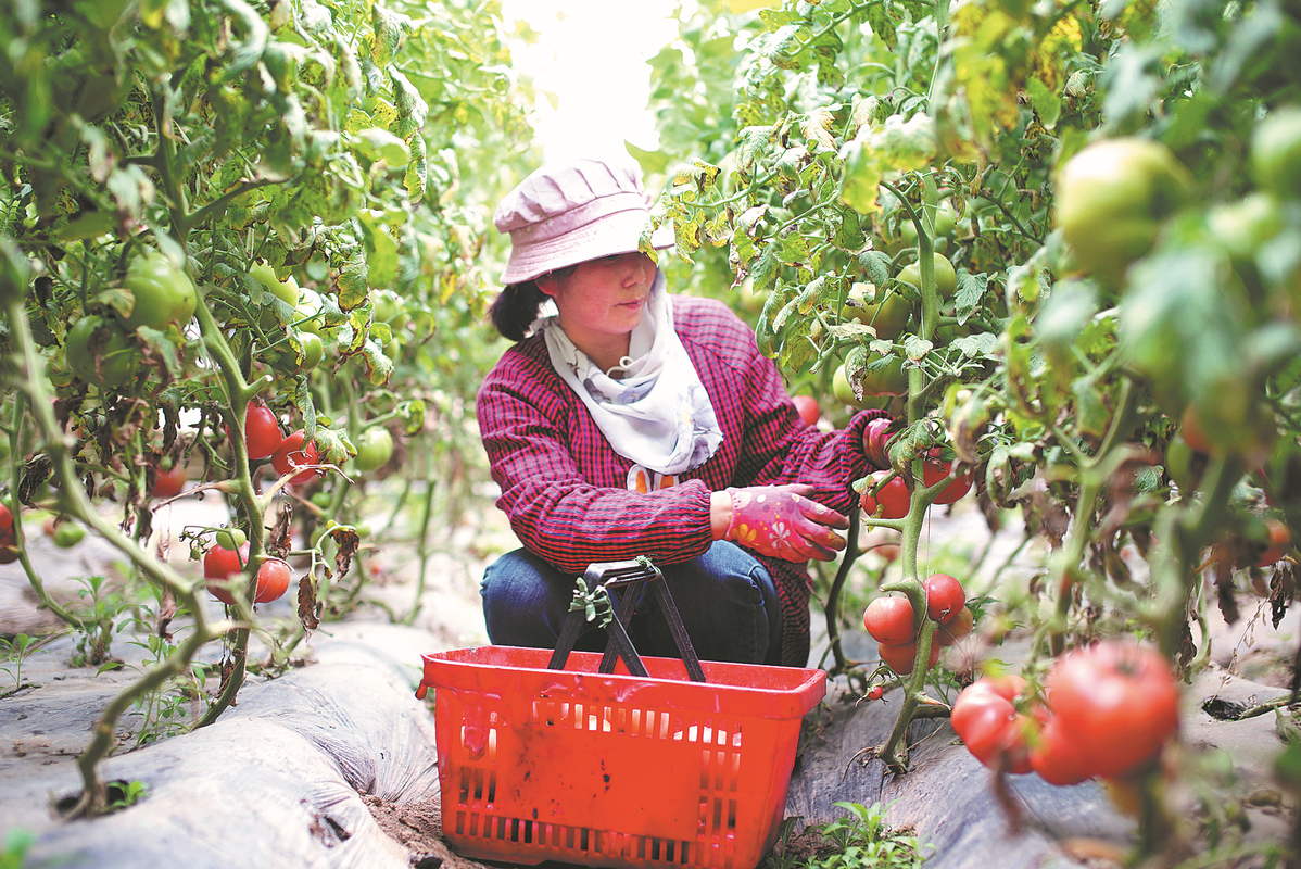 A farmer picks tomatoes at a greenhouse in Tongfu Rural Revitalization Park in Tayuanzhuang village, Zhengding county, Hebei province. [WU ZHIWEI/FOR CHINA DAILY]