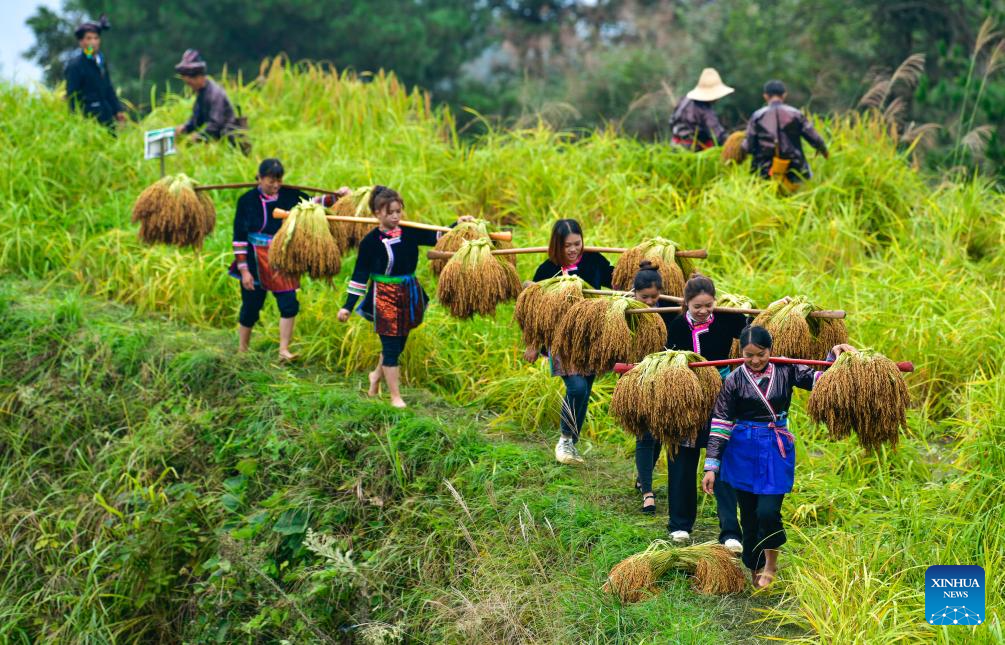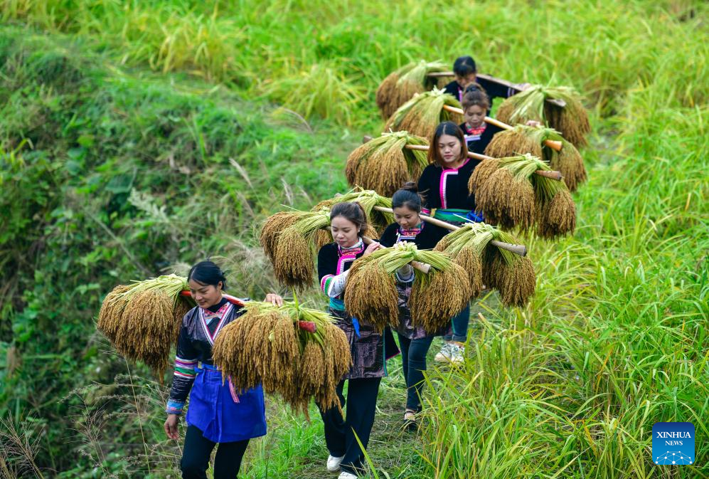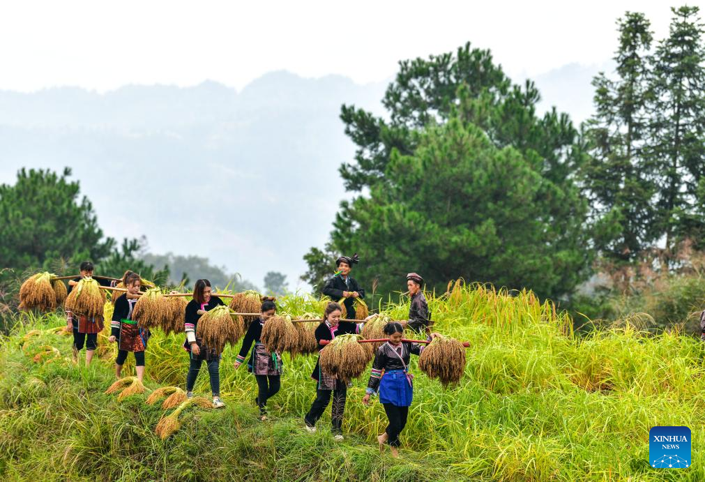 Villagers carry newly harvested glutinous rice in Jianhua Village of Congjiang County of Qiandongnan Miao and Dong Autonomous Prefecture, southwest China's Guizhou Province, Oct. 11, 2023. (Xinhua/Yang Wenbin)