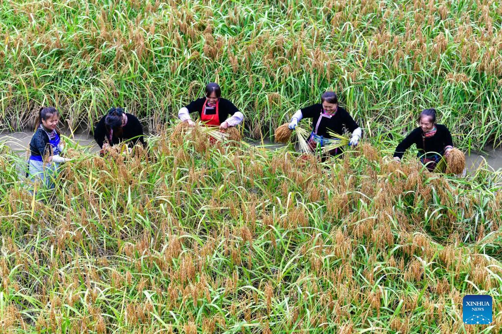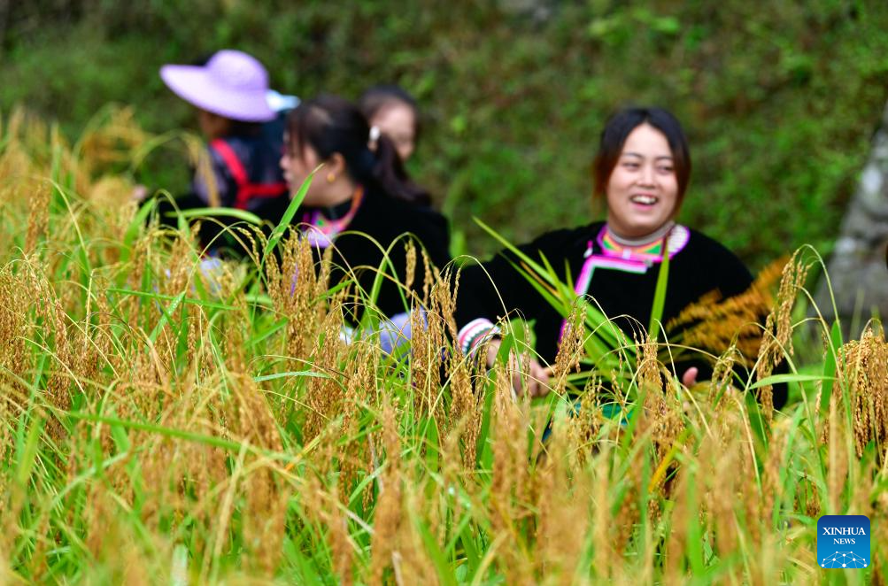 Villagers harvest glutinous rice in Jianhua Village of Congjiang County of Qiandongnan Miao and Dong Autonomous Prefecture, southwest China's Guizhou Province, Oct. 11, 2023. (Xinhua/Yang Wenbin)